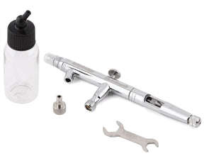 The Bittydesign Michelangelo Dual Action Bottle Feed Airbrush features a threadless 0.4mm nozzle designed for easy removal and maintenance. The "dual action" trigger allows precision control the air and color flow - press down to control the air supply, and pull back to control the color. Used in the Bittydesign paint shop, the Michelangelo has been put through intense daily use as a production tool, and has proven reliable and efficient. The quick coupling of the paint bottle saves time when changing colors and avoids wasting paint, and 35cc volume holds a large amount of paint allowing large area coverage.